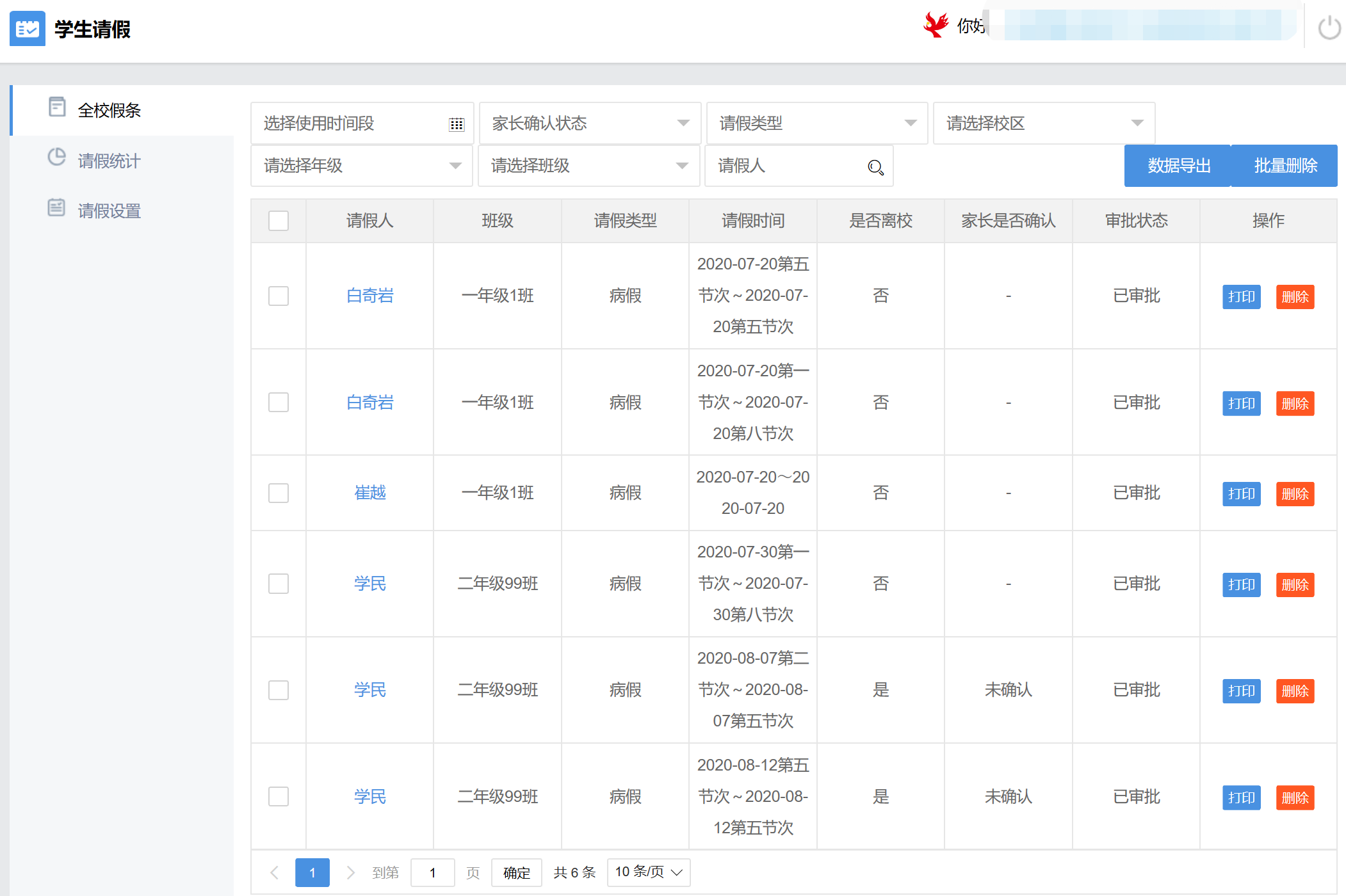 学生请假管理旨在对学生请假行为进行统一管理,有效的记录学生的每一次请假情况。系统除了学生请假、班主任审批之外,还提供家长代请假和班主任代请假功能,以满足不同的请假场景。